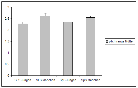 Die gemittelte Pitch-range der Mütter von Kindern mit SES war 2.42 (SD = 0.38), die der Mütter von Kindern mit SpS war 2.45 (SD = 0.30). D.h., die Pitch- range der Mütter von Kindern mit SES war nominell niedriger als von Kindern mit SpS
